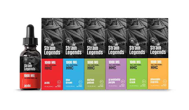 Our Stain Legends tinctures are a good example of custom tinctures. These formulas feature 10:1 profile Full Spectrum Distillate with HHC (Hexahydrocannabinol) for customers who seek the efficacy of full spectrum cannabinoids, but prefer a legal euphoric effect. Available in 1000 mg, 2000 mg and 3000 mg concentrations in a range of popular cannabis strain terpene profiles: |